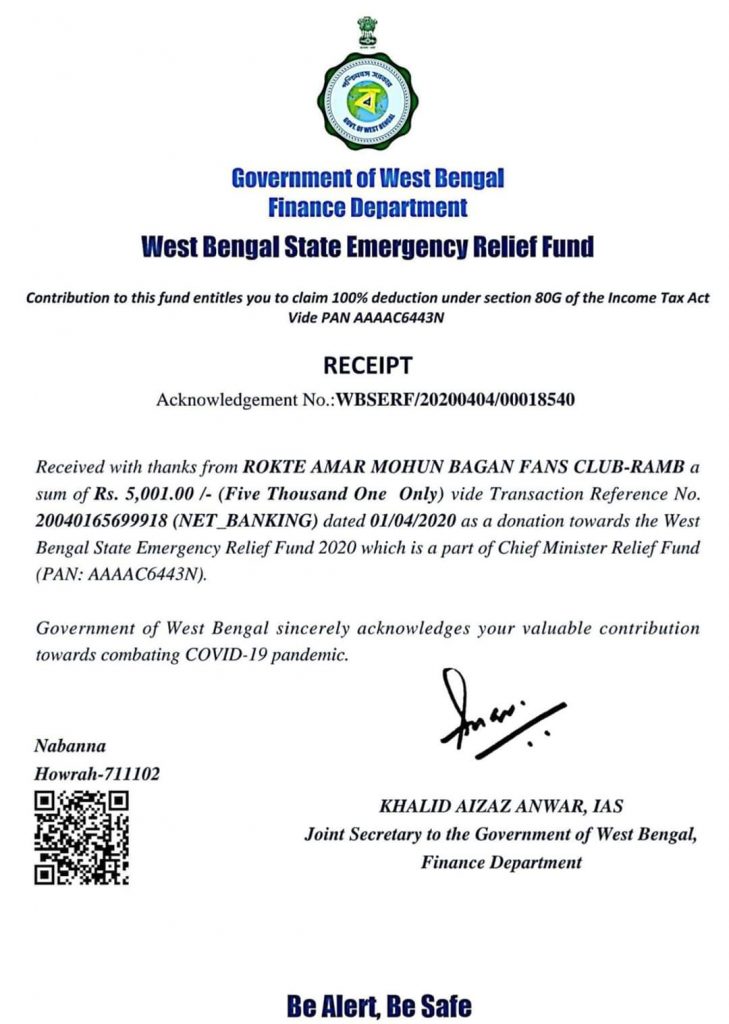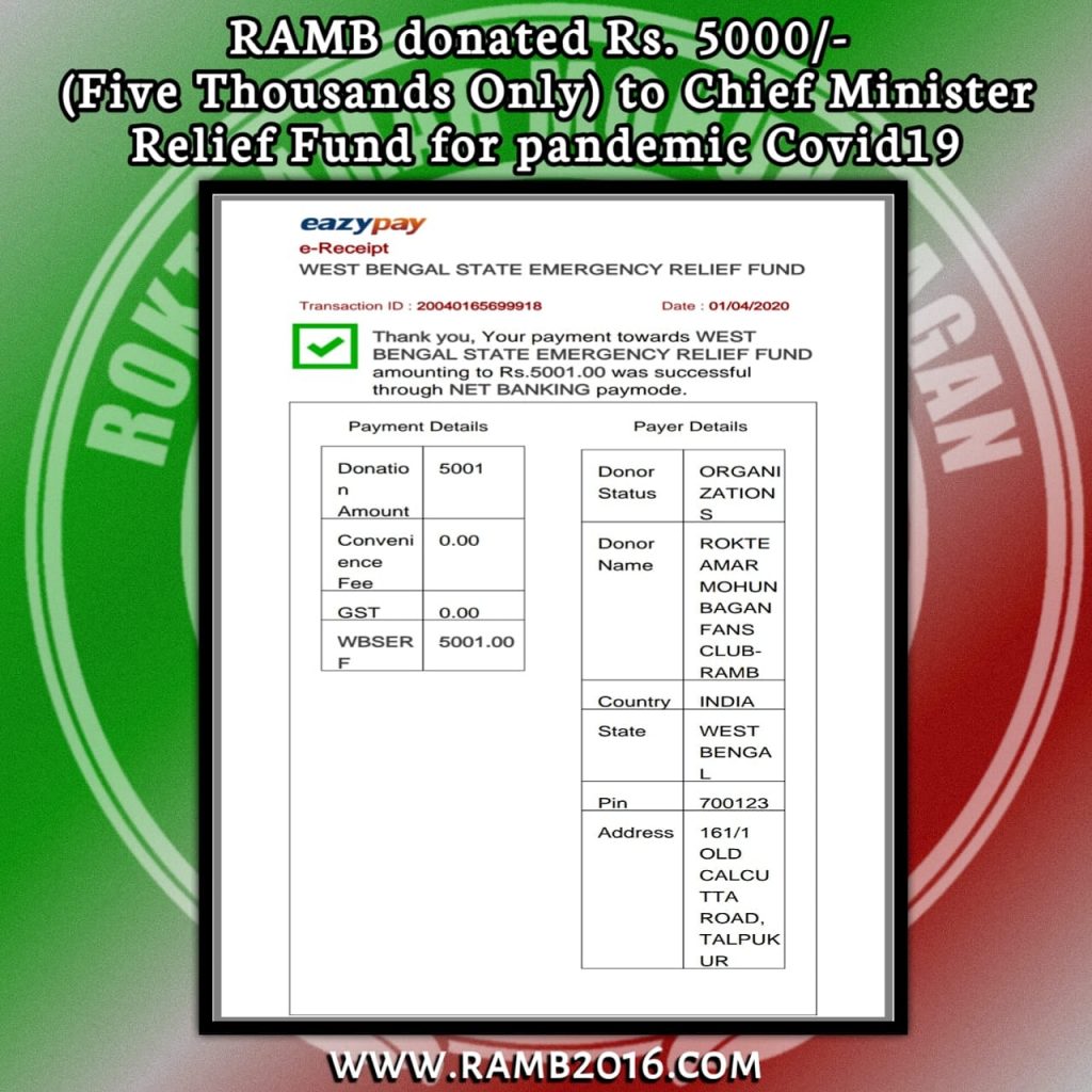 No Imitation, Creation Is Our ReligionThe whole world is fighting this deadly disease called COVID 19. It hasn’t spared India as well. We Indians are together to fight this. Our Chief Minister of West Bengal is doing a tremendous job in protecting West Bengal by her efforts and sensible actions. When she has asked us to come forward …how can RAMB- Rokte Amar Mohunbagan Fan club can stay behind ….we always do a lot of functions and activities to keep our culture alive and this time we came forward and donated the above mentioned amount to keep alive our fellow citizens.
